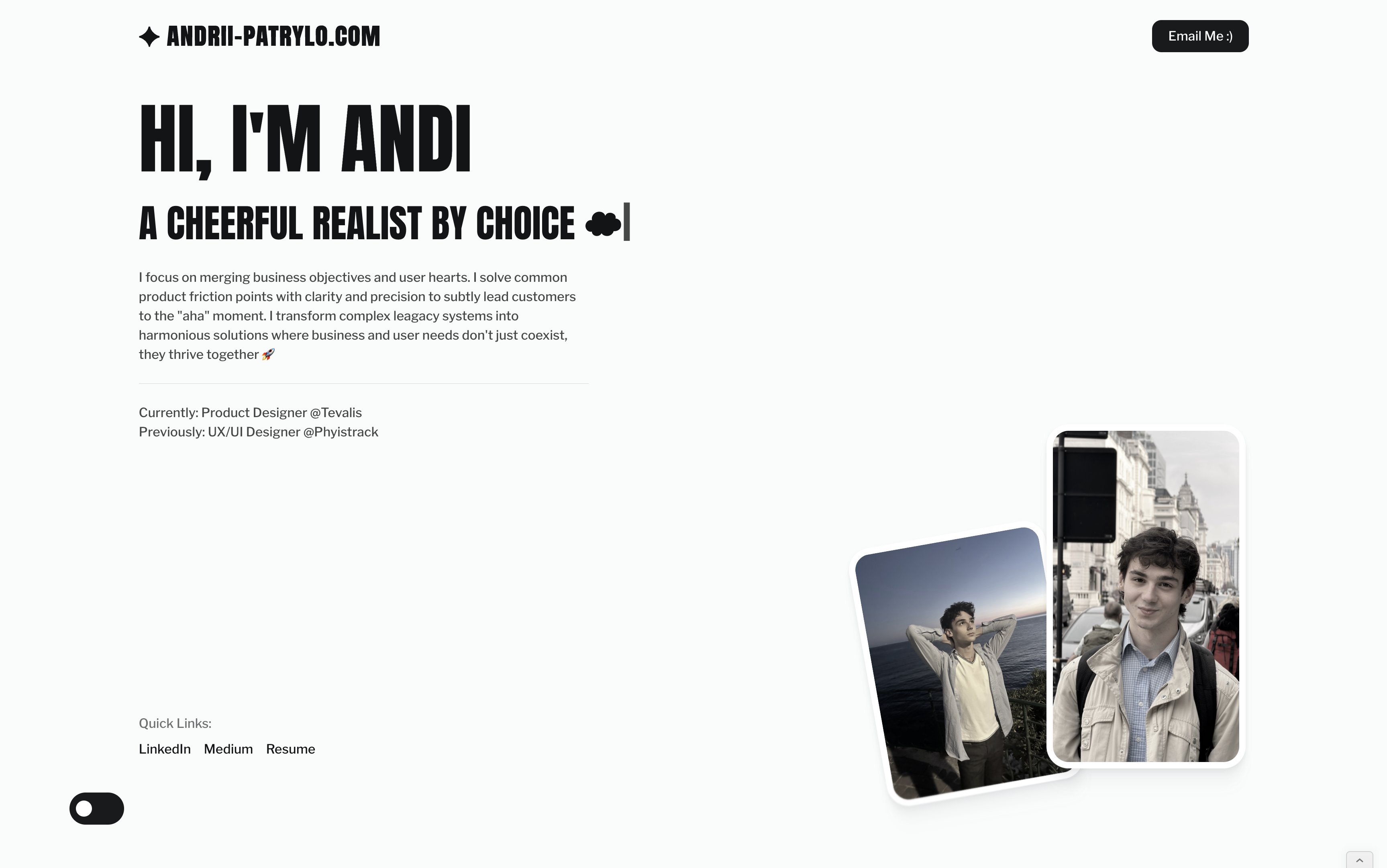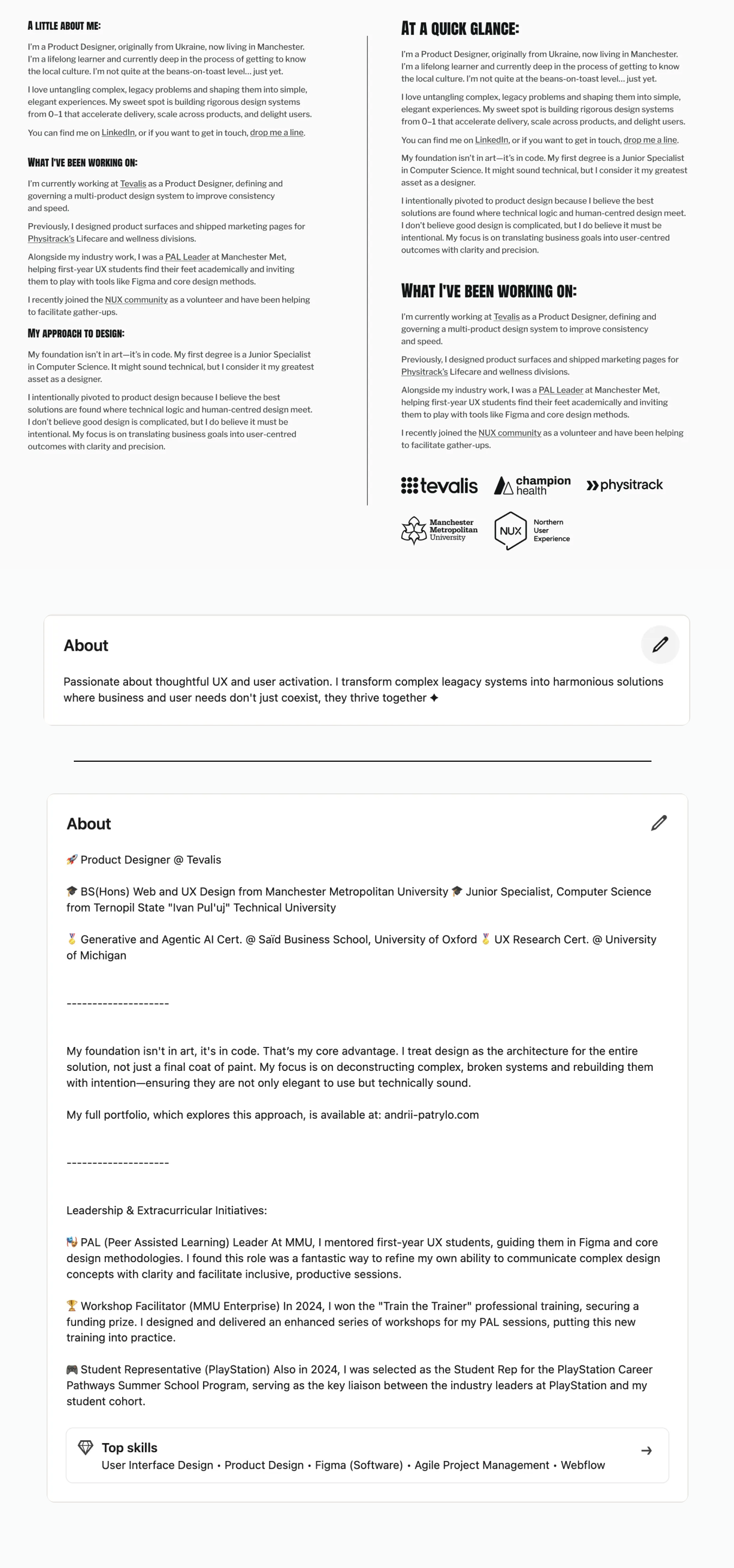 A portfolio redesign that reframed my identity as a systems-minded product designer—balancing business clarity, UX craft, and technical depth.