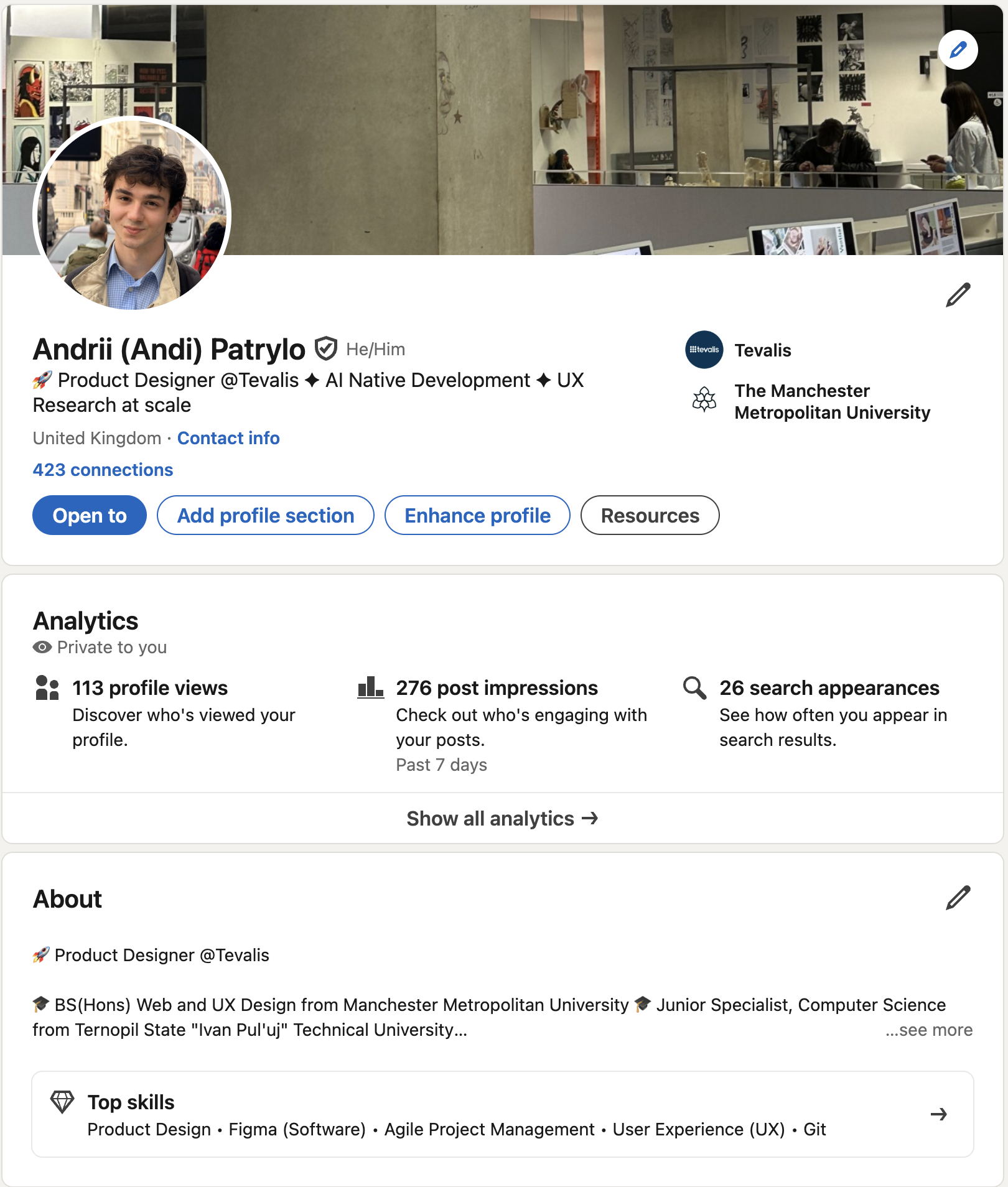 Peer and professional feedback provided concrete insights into how my portfolio was being interpreted. Drawing on Petrides and Vila de Brito's (2024) framework of branding, engagement, networking, and conversion (fig. 7.1), I identified specific gaps in my self-presentation. For instance, one reviewer pointed out that my "About" section underplayed my technical background and mentoring work—both central to my positioning as a versatile generalist. This prompted revisions across both my portfolio and LinkedIn to better surface these capabilities.