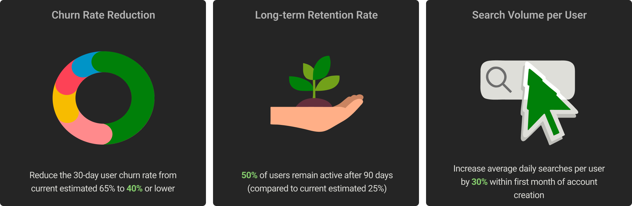 I identified three main KPIs that align with their environmental mission: Churn Rate Reduction, Search Volume per User, and Long-term Retention Rate.