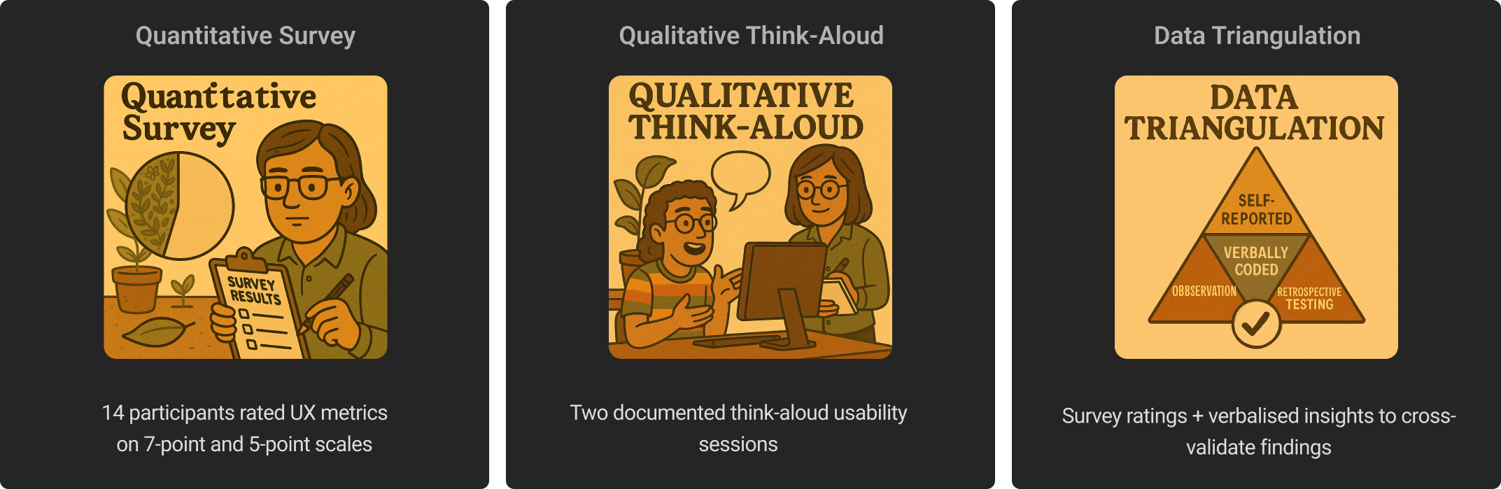 - Qualitative: think-aloud sessions with 5 users captured spontaneous reactions and emotional responses.